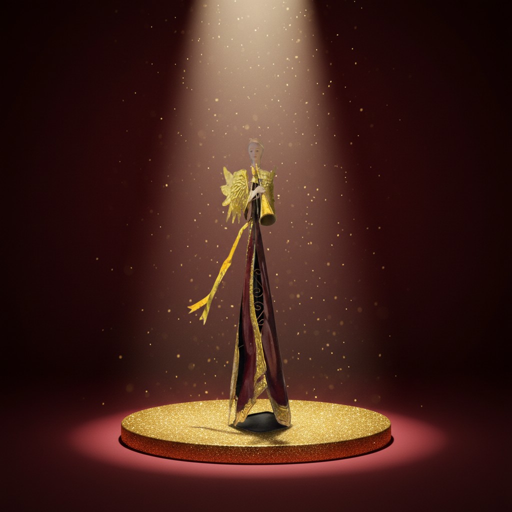O contraste entre o branco elegante, o vermelho profundo e os detalhes dourados cria uma estética refinada e atemporal. As asas em acabamento metálico dourado refletem a luz de forma sutil, enquanto o vestido com detalhes ornamentais adiciona textura e riqueza visual à peça.