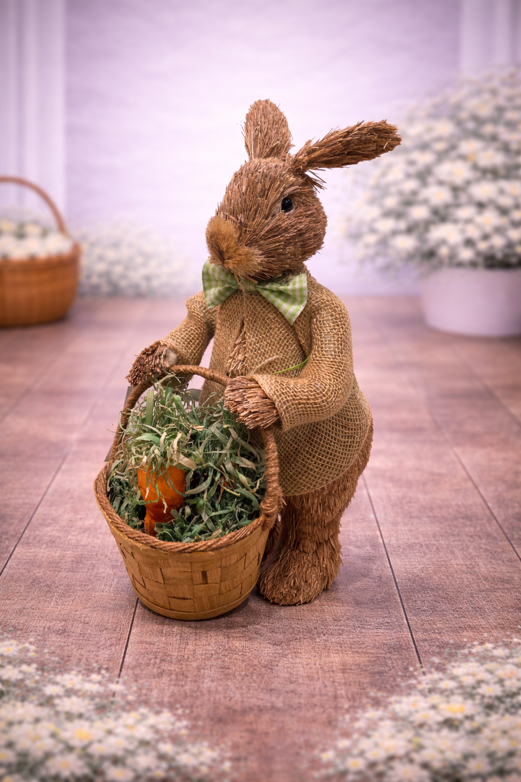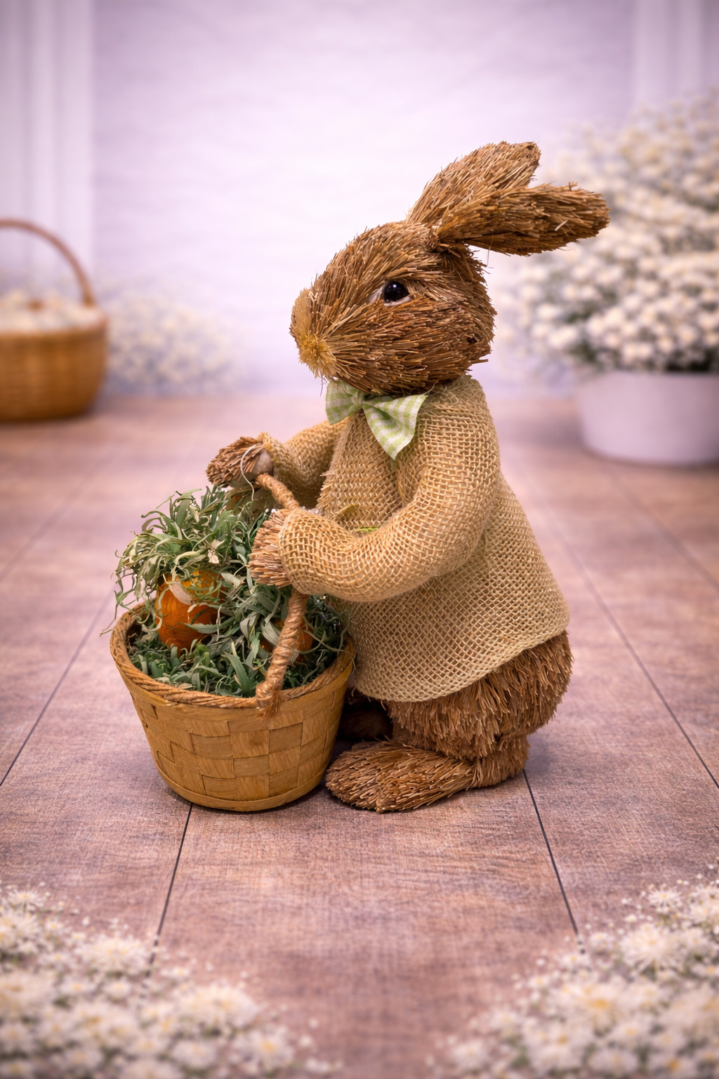 Charmoso e cheio de personalidade, o Coelho Decorativo com Cesto é uma peça que traduz perfeitamente o espírito acolhedor e rústico da Páscoa. Confeccionado com acabamento em fibras naturais e detalhes em tecido, ele segura delicadamente um cesto repleto de folhagens e cenouras decorativas, criando uma composição rica em texturas e extremamente convidativa.