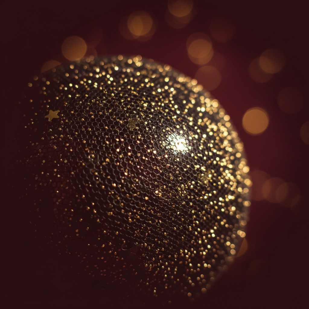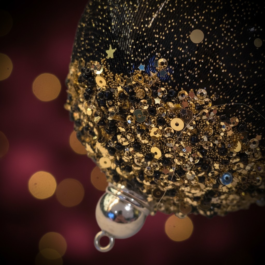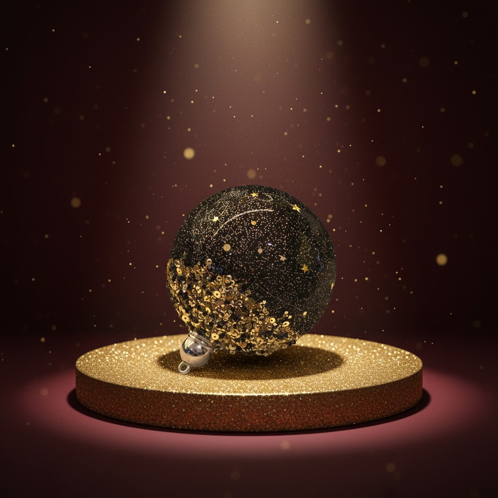 O efeito visual remete a um céu estrelado, trazendo um ar moderno e ao mesmo tempo mágico para a decoração. A combinação entre o escuro intenso e o dourado reluzente cria um contraste marcante, perfeito para árvores mais elaboradas ou para equilibrar paletas clássicas com um toque contemporâneo.