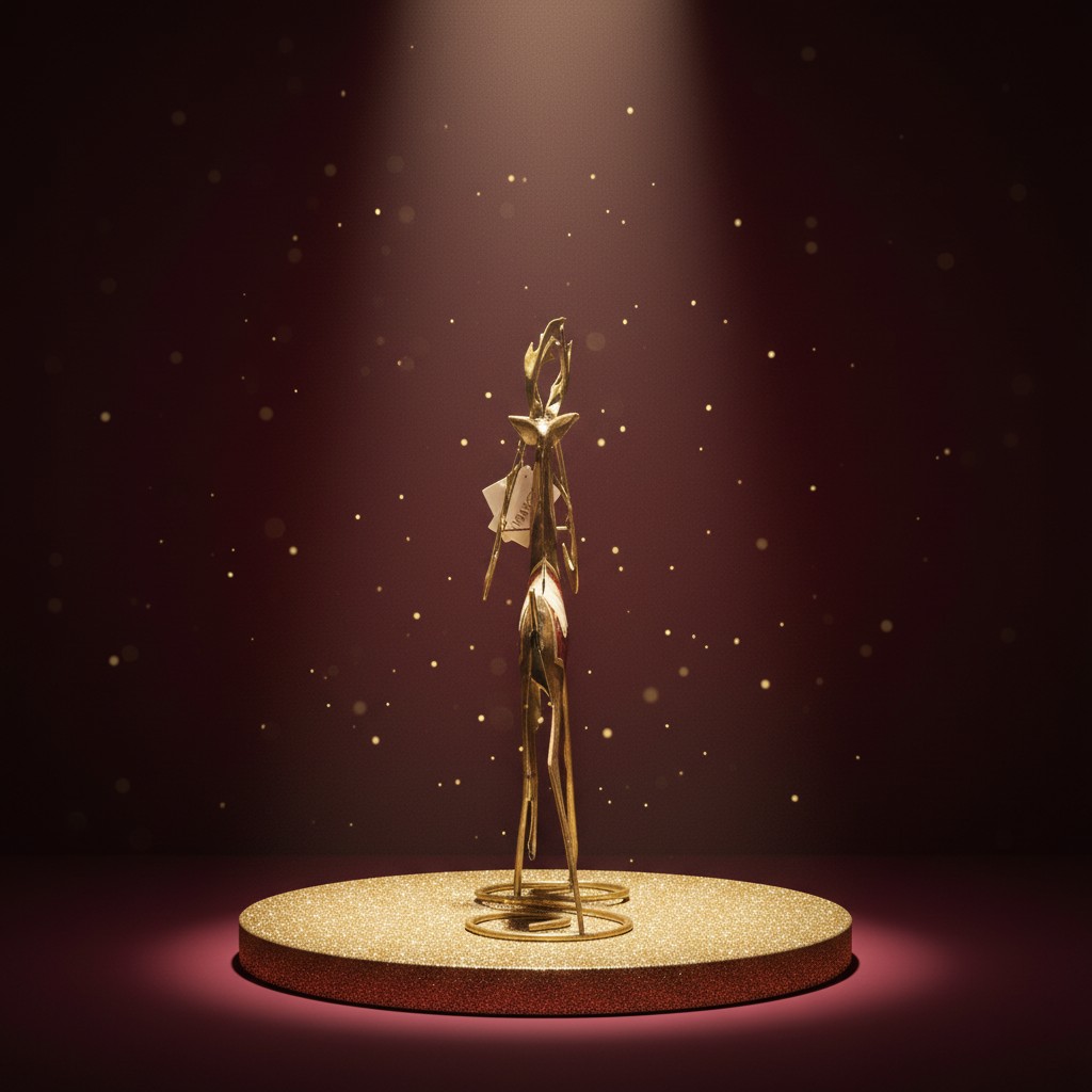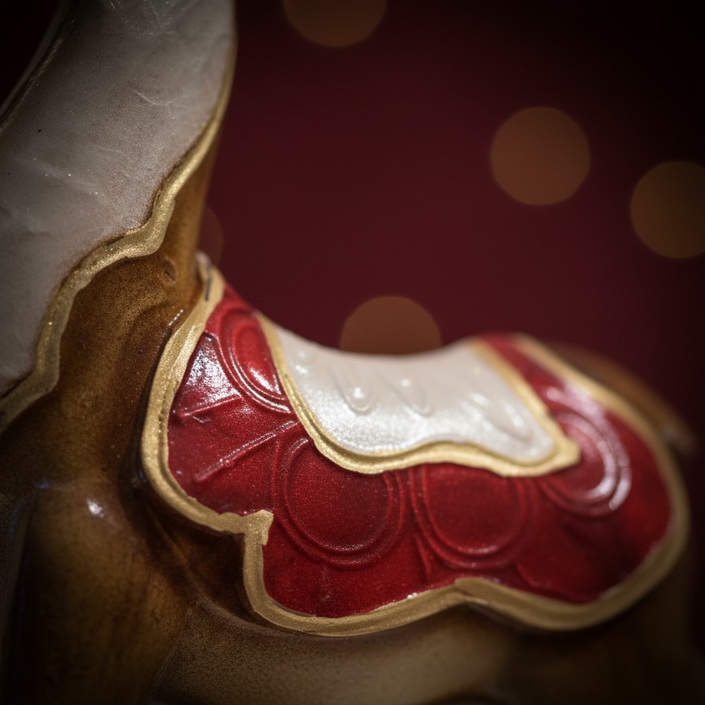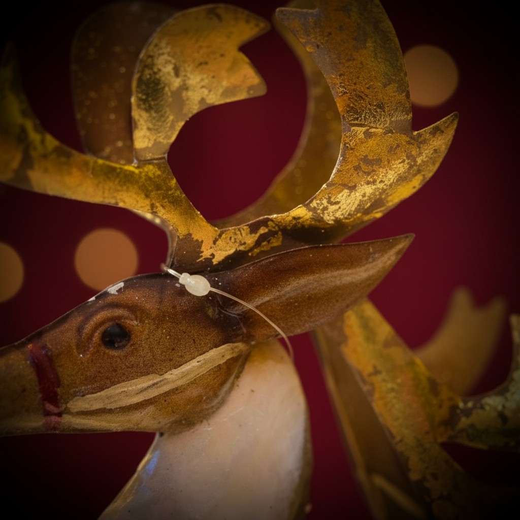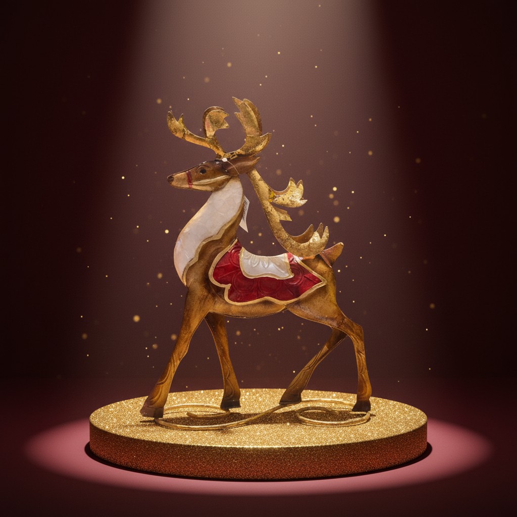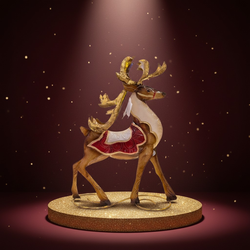 O contraste entre o dourado e o vermelho profundo valoriza a estética tradicional natalina, enquanto o acabamento metálico confere brilho sutil e destaque à peça. Os chifres ornamentados e os detalhes suaves no corpo adicionam um toque artesanal, tornando cada ângulo visualmente interessante.