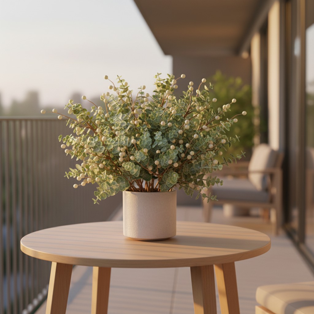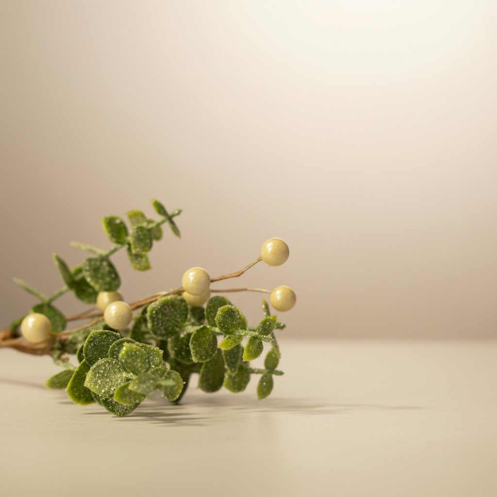 Elegante e delicadamente luminoso, o Spray de Eucalipto com Glitter e Pérolas Brancas traz um toque sofisticado e contemporâneo para suas composições decorativas. Seus ramos finos, enriquecidos com folhas levemente texturizadas e acabamento sutil em glitter, ganham destaque com as delicadas pérolas brancas que refletem a luz com suavidade.