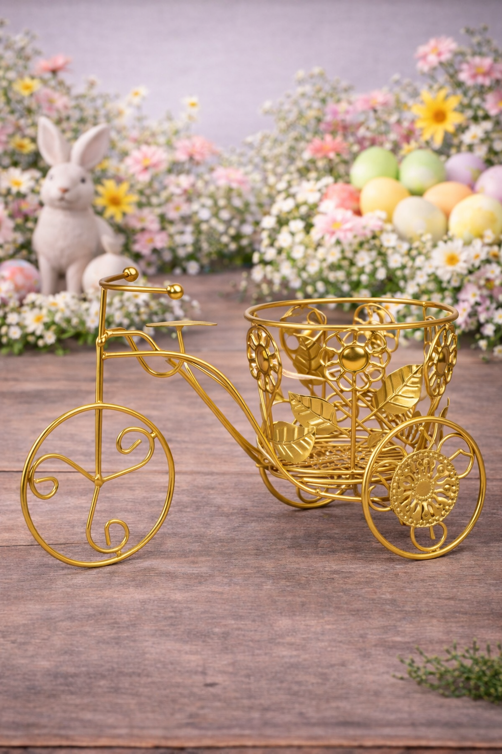 O Triciclo Aramado Decorativo Dourado é uma peça charmosa e cheia de detalhes, ideal para criar composições delicadas e sofisticadas. Com estrutura metálica aramada, acabamento dourado e desenho mais ornamental, ele traz um ar romântico e artesanal que valoriza qualquer cenário decorativo.